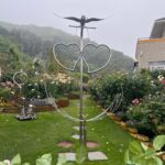ステンレスやアルミ、アイアンなどで作られた現代アート作品が、太陽の光を反射してキラキラと輝きます。柔らかな薔薇の曲線とクールなオブジェの直線が織りなすコントラストは、この庭園唯一無二の芸術的な景観を生み出しています。